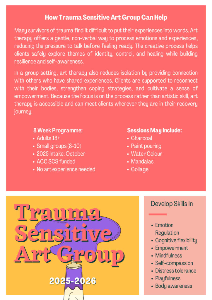 ACC sensitive claims clients If you have an approved ACC sensitive claim – ACC provides in addition to your individual therapy an extra 32h each year for adjacent group therapy. Southern Alps Psychology provides a range of Group Therapy programmes which include: Community and corporate groups The groups offered above and a variety of bespoke group skill…